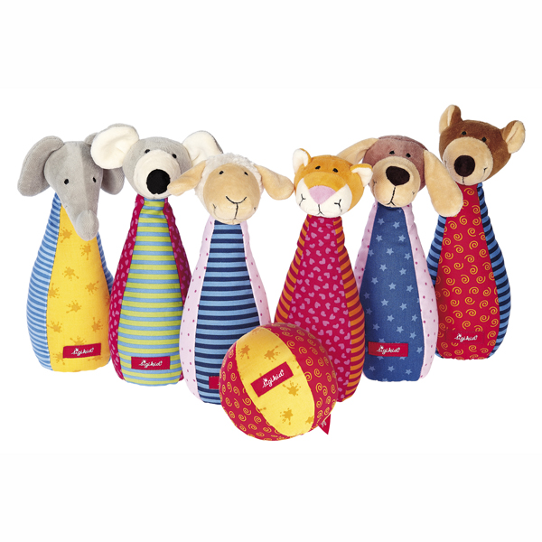 ぞう、ねずみ、ひつじ、ねこ、いぬ、くまの6種類のかわいい動物たちのピンをねらって、ボールを転がしてボーリング大会ができる、アニマルボーリングです。