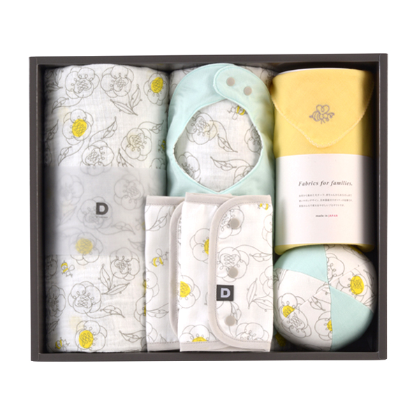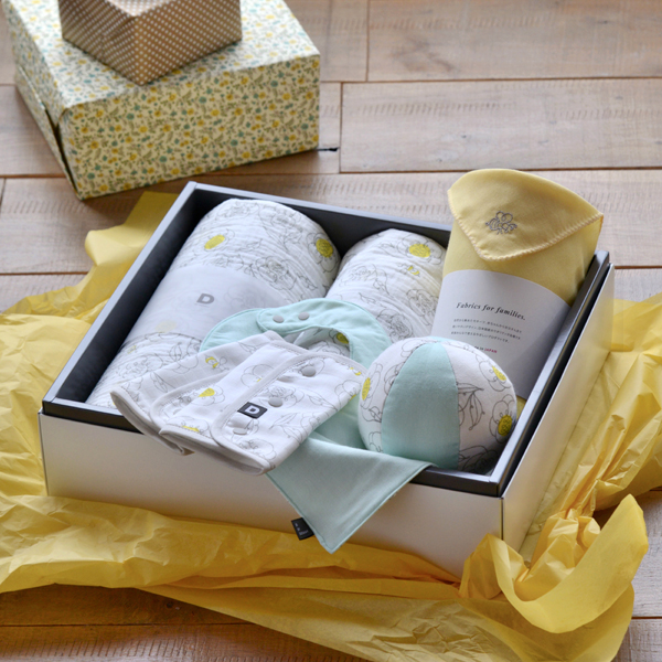 内容は、おくるみガーゼストール、ポケットガーゼビブ、ソフトガーゼボール、6重ガーゼベルトカバー、オリジナルハンカチ(無地/イエロー)となっています。