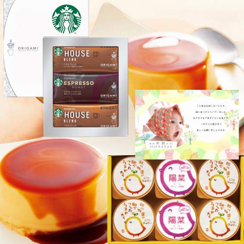 プリンと一緒に大人気のスターバックスコーヒーをセットにした出産祝いのお返し(出産内祝い)にもらう方も喜んでくださること間違いなしのうれしいギフトセットです。