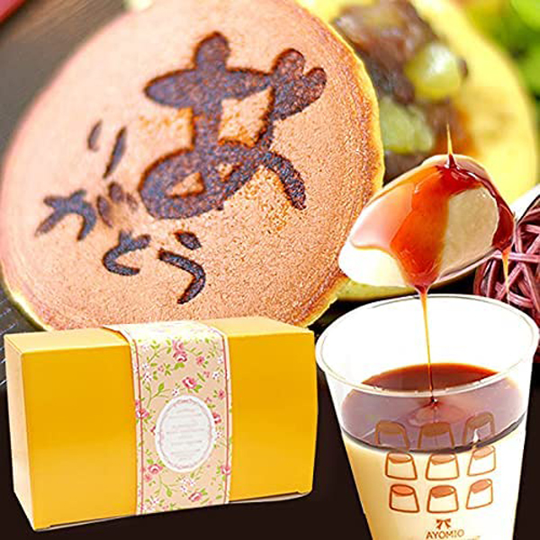 焼き印で「ありがとう」のメッセージが入ったお芋入りどら焼き+とろ~りカラメルがおいしいスイートポテトプリンのスイーツセットです。